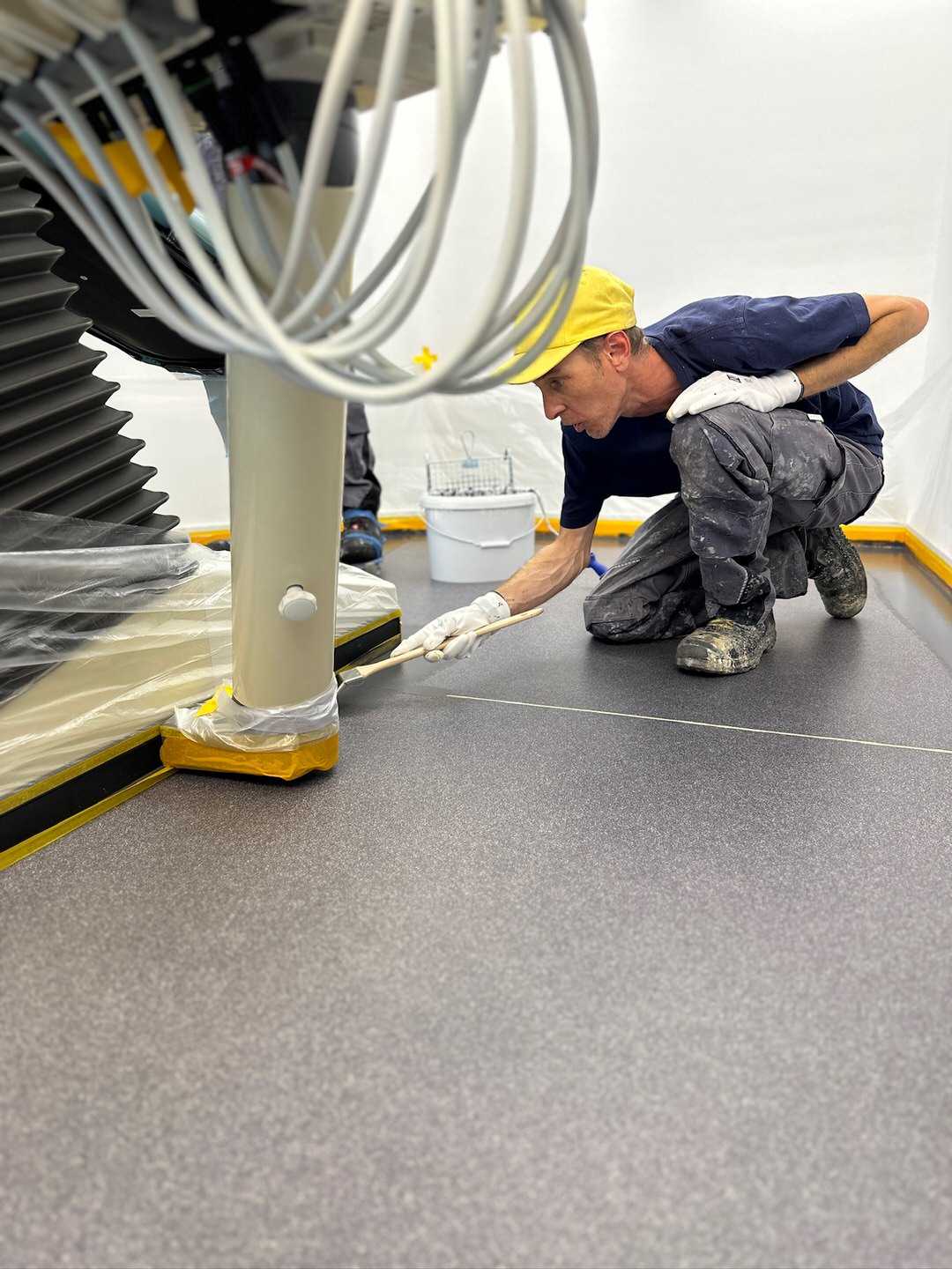 Der vorhandene Linoleumboden wird mit Spezialreinigungspads und Grundreiniger gründlich gereinigt und mechanisch für die Beschichtung vorbereitet.